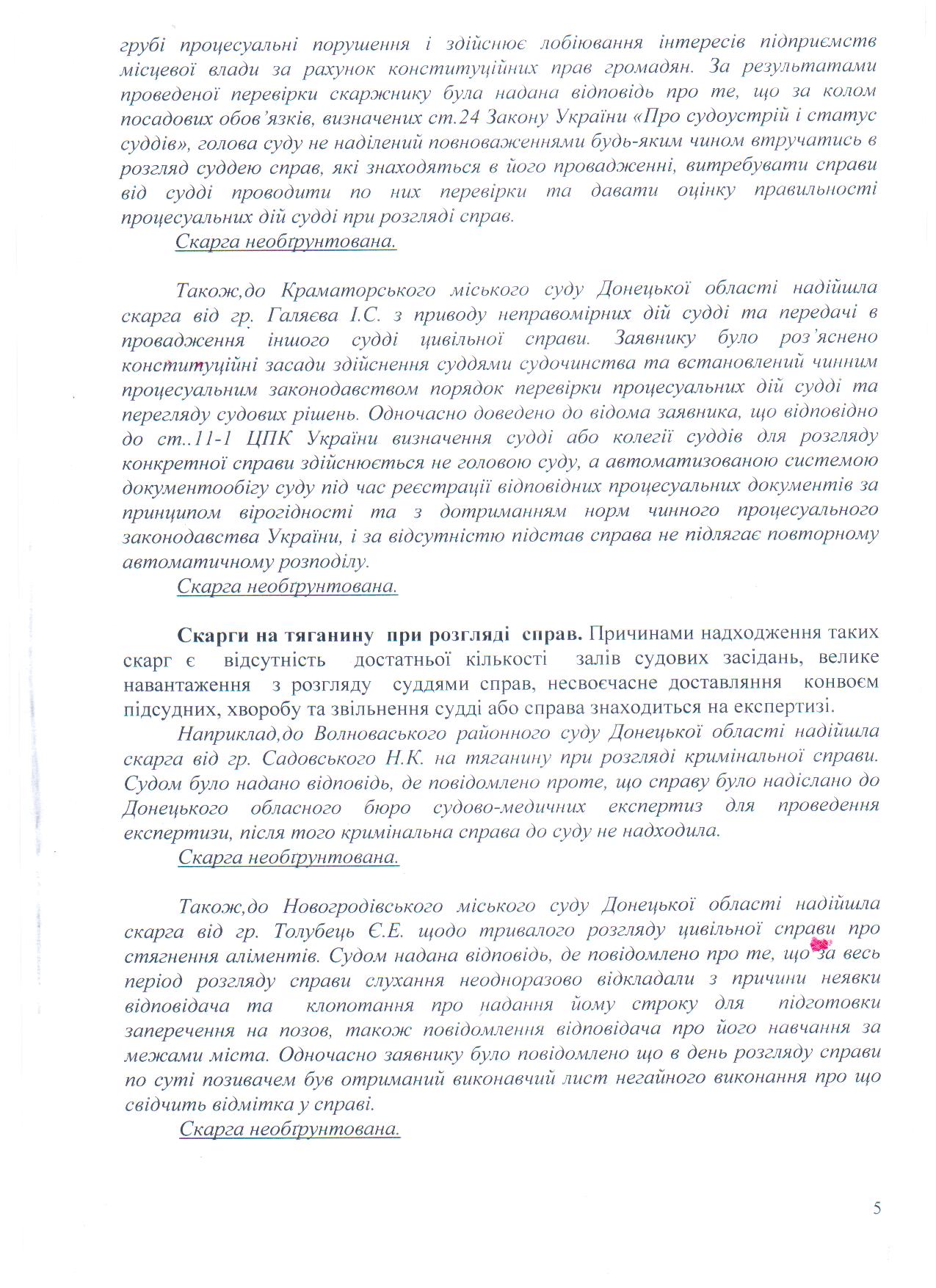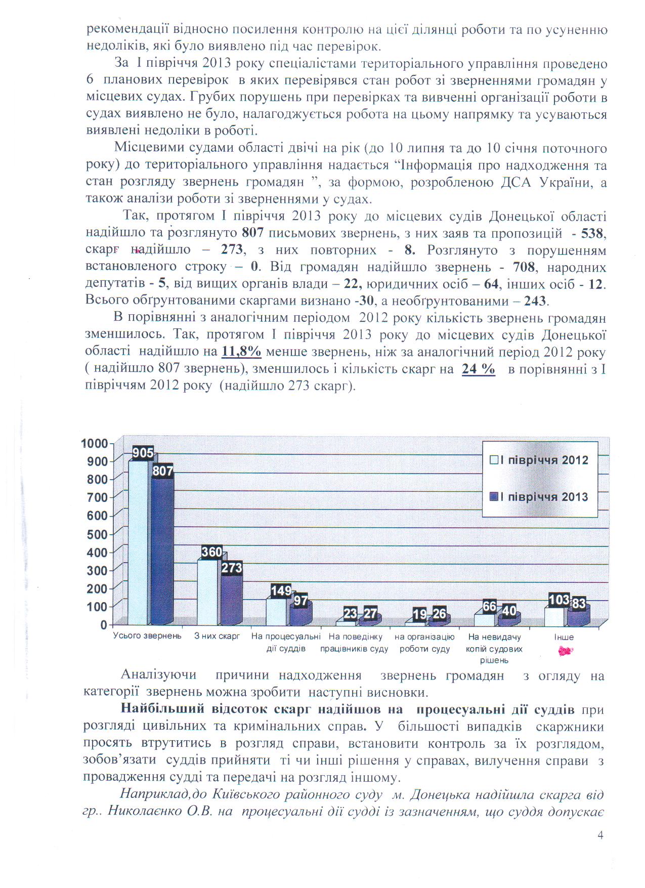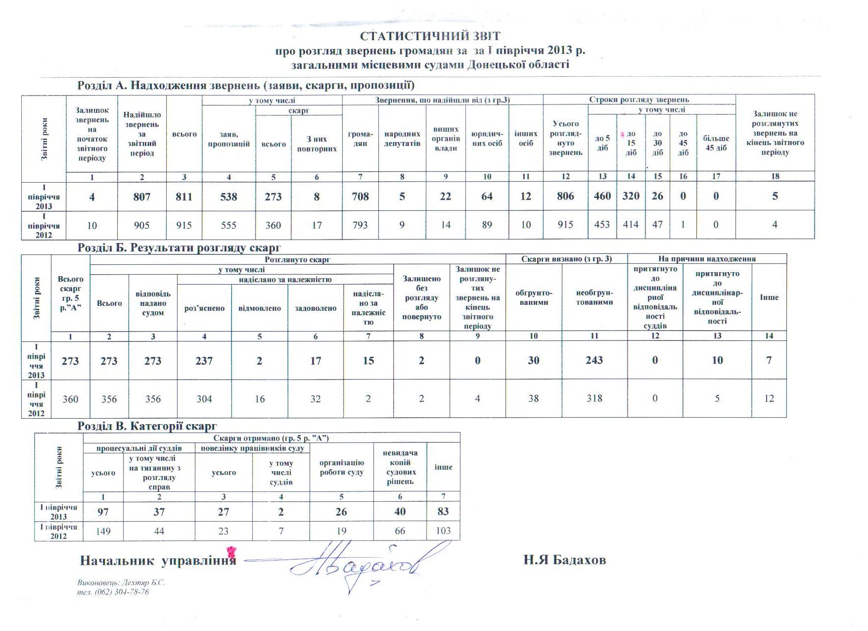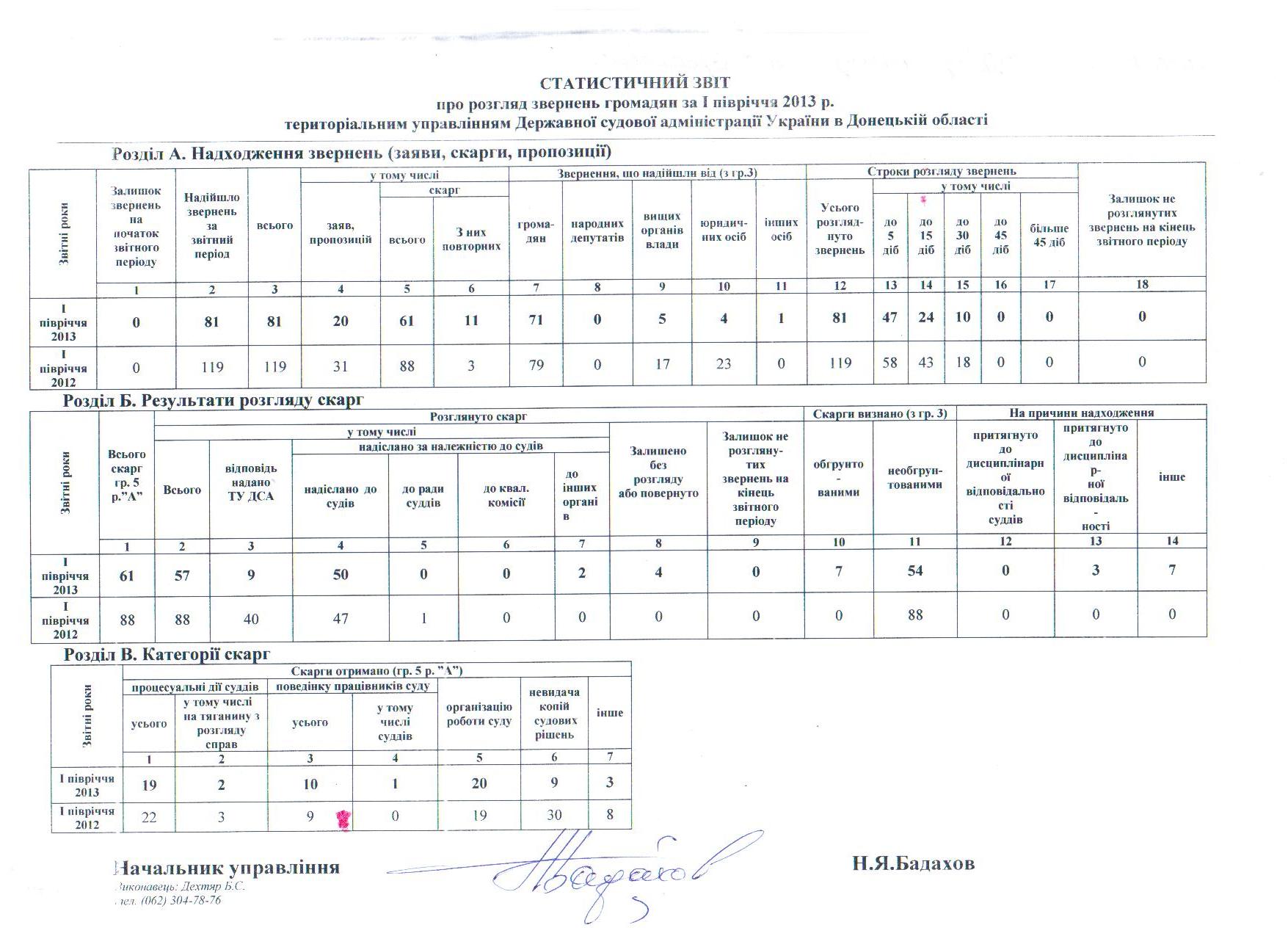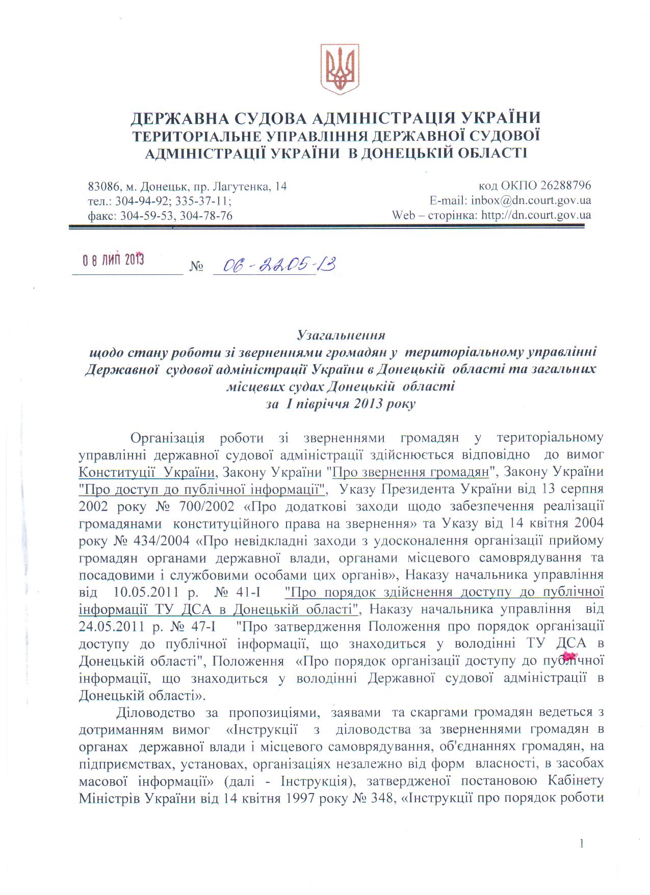 Узагальнення щодо стану роботи зі зверненнями громадян у територіальному управлінні Державної судової адміністрації України в Донецькій області та загальних місцевих судах Донецькій області за І півріччя 2013 року