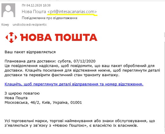 Перше, на що завжди варто звертати увагу - це адреса відправника. Якби цього листа надіслали співробітники Нової Пошти, то вірогідно, вони б зробили це з корпоративної електронної скриньки в їх поштовому домені - @novaposhta.ua Але іноді зловмисники вміло ховають справжню адресу, тому дивимося інші деталі.